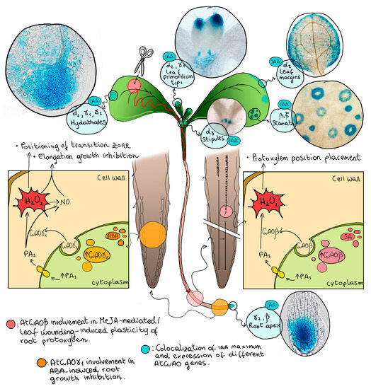 Involvement of AtCuAOs in long distance signaling and stress-induced phenotypic plasticity. Pink circles: schematic representation of AtCuAOβ involvement in MeJA-mediated/leaf wounding-induced plasticity of root protoxylem. Leaf-wounding triggers a long-distance leaf-to-root signaling leading to MeJA-mediated/AtCuAOβ-driven early root protoxylem differentiation, highlighted by changes in root protoxylem position (i.e., the distance from the root apical meristem of the first protoxylem cell with fully developed secondary wall thickenings) [39,41]. Blu circles: co-localization of [IAA] maximum and the expression of AtCuAO genes. Images associated to [IAA] maximum show GUS staining microscopy analysis of AtCuAOα2/α3/γ1/γ2/β promoter::green fluorescent protein-β-glucuronidase fusion (prom-AtCuAO::GFP-GUS) transgenic plants (unpublished images; transformed plants and experimental conditions have been described in [38,39]). Representative images for each tissue/organ are shown. Orange circles: A schematic representation of AtCuAOγ1 involvement in ABA-induced root growth inhibition by elongation growth regulation and transition zone positioning [48].