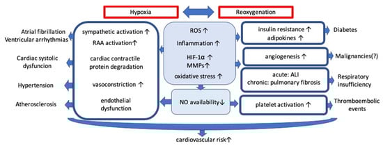 Mechanisms contributing to the progression of cardiovascular disorders. Abbreviations: ROS: reactive oxygen species; HIF-1α: hypoxia inducible factor 1α; MMPs: matrix metalloproteinases; ALI: acute lung injury; RAA: renin-angiotensin-aldosterone; NO: nitric oxide; ↑: increased; ↓: decreased.