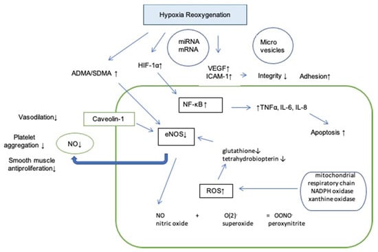 Influence of hypoxia reoxygenation on endothelium. Abbreviations: HIF-1α: hypoxia inducible factor 1 alpha; VEGF: vascular endothelial growth factor; ICAM-1: intercellular adhesion molecule 1; NF- κB: nuclear factor kappa-light-chain-enhancer of activated B cells; TNFα: tumor necrosis factor alpha; IL-6: interleukin 6; IL-8: interleukin 8; SDMA: symmetric dimethylarginine; ADMA: asymmetric dimethylarginine; ROS: reactive oxygen species; eNOS: endothelial nitric oxide synthase; NO: nitric oxide; ↑: increased; ↓: decreased.