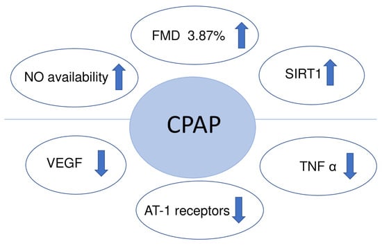 Endothelial function after treatment with CPAP. Abbreviations: VEGF: vascular endothelial growth factor; NO: nitric oxide; FMD: flow mediated dilation; SIRT1: sirtuin 1; TNFα: tumor necrosis factor alpha; AT-1 receptors: expression of angiotensin receptors type-1; ↑: increased; ↓: decreased.