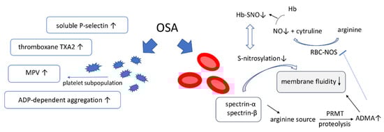 Arachidonic acid- and adenosine diphosphate (ADP)-induced aggregation in the OSA group was significantly higher than in the non-OSA group [100]. In experimental human and animal models induced hypoxia/reoxygenation contributed to enhanced TXA2 formation and increased activation of matrix metalloproteinase 2 (MMP-2) leading to platelet activation and subsequent aggregation [101,102].