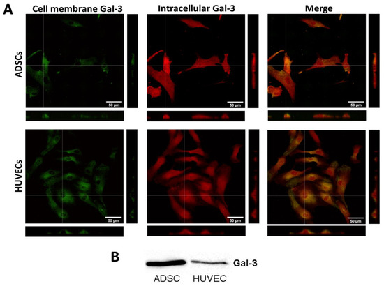 Localization of endogenous Gal-3 in ADSCs and HUVECs. (A) Immunofluorescence of Gal-3 in ADSCs and HUVECs in 1-day-old cultures. Cells were stained for Gal-3 present in the cell plasma membrane (green fluorescence) and for intracellular Gal-3 (red fluorescence). For Gal-3 staining, an anti-Gal-3 antibody produced in rabbits (Sigma-Aldrich, Cat. No. SAB4501746) was used. Orthogonal projections depict the localization of Gal-3 in the cell plasma membrane or the intracellular space. Andor Dragonfly 503 scanning disc confocal microscope; Zyla 4.2 PLUS sCMOS camera; objective HC PL APO 40×/1.10 W CORR CS2; scale bar 50 μm. (B) Western blot of Gal-3 expression in the cytosol of ADSCs and HUVECs. In both tested cell types, a Gal-3 band was detected at a size of 28 kDa.