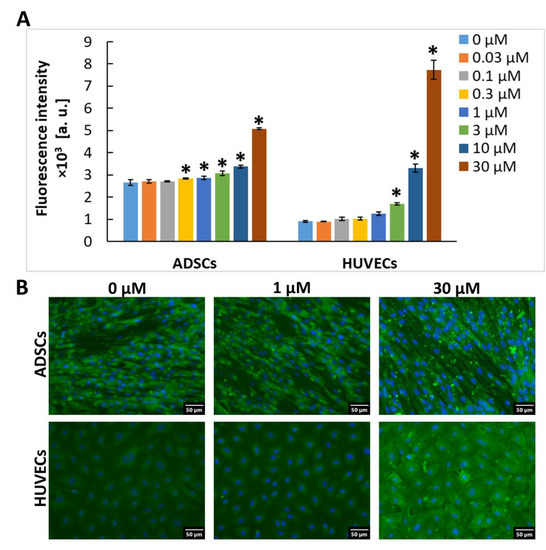 Furthermore, we tested whether ADSCs and HUVECs can associate with Gal-3 molecules in the extracellular environment when it was present in the cell culture media. For this purpose, confluent cells in 96-well tissue culture plates were incubated for 1 h with various concentrations (0.03 to 30 µM) of Gal-3 diluted in the cell culture medium, and the membrane-bound Gal-3 was stained by immunofluorescence (after fixation with PFA and without the use of detergents, i.e., without permeabilization of the cell membrane). After staining, it was apparent that, in the galectin-free medium, ADSCs were more intensively stained than HUVECs, which suggests a higher basal content of Gal-3 in the cell membrane of ADSCs (Figure 2). A similar pattern was observed in permeabilized cells (Figure 1A,B), which implies that the basal content of Gal-3 was also higher inside the ADSCs. When exposed to Gal-3 in the culture medium, the intensity of fluorescence of Gal-3 in cells gradually increased with the increasing Gal-3 concentration, and this increase became statistically significant (in comparison with untreated cell samples) at 0.3 µM and 3 µM Gal-3 concentrations in ADSCs and HUVECs, respectively (Figure 2). At the 3 µM concentration, the intensity of the fluorescence of Gal-3 in ADSCs was still higher than in HUVECs. However, at the 10 µM concentration, the intensity of the fluorescence of Gal-3 was similar in ADSCs and HUVECs, and at 30 µM of Gal-3 in the cell culture medium, HUVECs showed a stronger ability to bind Gal-3, reaching a higher intensity of the fluorescence signal than ADSCs (Figure 2A).