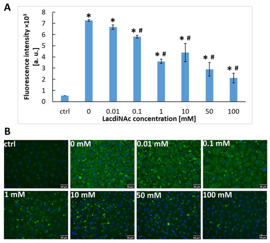 HUVECs after 1 h of incubation in a cultivation medium containing Gal-3 (30 μM) and various concentrations of LacdiNAc (0–100 mM). Control cells were incubated with a pure cultivation medium without Gal-3 and LacdiNAc. (A) Intensity of the fluorescence signal in HUVECs stained for Gal-3 (ex./em. = 485/528 nm). The data are shown as the mean ± SD from 3 wells. Holm-Sidak test, p ≤ 0.05. * Statistically significant difference in comparison with the control cells in the pure cultivation medium (ctrl). # Statistically significant difference in comparison with cells without LacdiNAc (0). (B) Immunofluorescence of Gal-3 in the cells compared in graph A. Anti-Gal-3 antibody (EP2775Y) produced in rabbits (Abcam, Cambridge, UK; Cat. No. ab76245) was used. The cell nuclei were counterstained with Hoechst 33258. Olympus IX 71 microscope, DP 70 digital camera, obj. 20×, scale bar 50 μm.