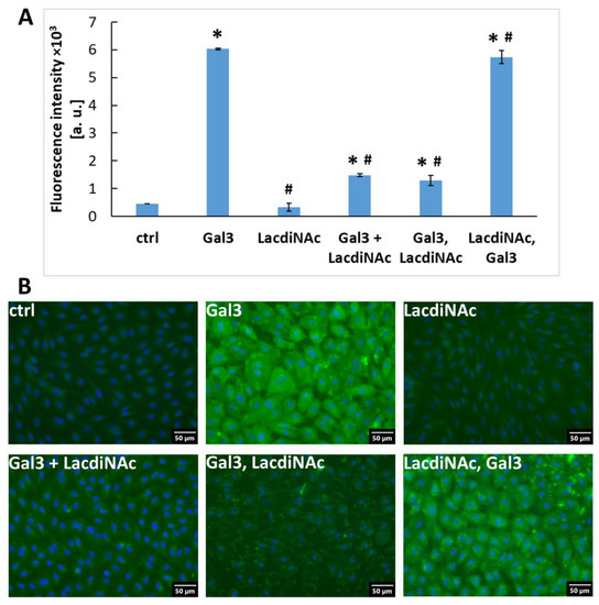 HUVECs after incubation in a cultivation medium containing Gal-3 (30 μM) or LacdiNAc (1 mM) or both molecules added together or in a different order. Control cells were incubated for 1 h in a pure cultivation medium. (A) Intensity of the fluorescence signal in HUVECs stained for Gal-3 (ex./em. = 485/528 nm). The data are shown as the mean ± SD from 3 wells. Holm-Sidak test, p ≤ 0.05. * Statistically significant difference in comparison with cells in the pure medium (ctrl), # Statistically significant difference in comparison with cells incubated with Gal-3 (Gal-3). (B) Immunofluorescence of Gal-3 in the cells compared in graph A. Anti-Gal-3 antibody (EP2775Y) produced in rabbits (Abcam, Cambridge, UK; Cat. No. ab76245) was used. The cell nuclei were counterstained with Hoechst 33258. Olympus IX 71 microscope, DP 70 digital camera, obj. 20×, scale bar 50 μm. Ctrl: cells in the pure medium; Gal3: cells incubated for 1 h in the medium with Gal-3; LacdiNAc: cells incubated for 1 h in the medium with 1-mM LacdiNAc; Gal3 + LacdiNAc: cells incubated for 1 h in the mixture of Gal-3 and LacdiNAc; LacdiNAc, Gal3: cells incubated for 1 h in the medium with LacdiNAc, then for 1 h in the medium with Gal-3; Gal3, LacdiNAc: cells incubated for 1 h in the medium with Gal-3, then for 1 h in the medium with LacdiNAc.