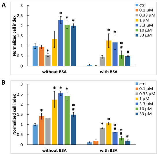Initial adhesion of ADSCs (A) and HUVECs (B) to the wells of the E-plates in the xCELLigence system 1 h after seeding. The wells were adsorbed with various concentrations of Gal-3 (0.1–33 μM) either without blocking or with blocking using 0.5% w/v BSA. Cell index values were normalized to the control cell sample without adsorbed Gal-3 and BSA (ctrl without BSA). Mean ± SD (n = 3). Holm-Sidak test, p ≤ 0.05. The cell samples were statistically compared either within the group without BSA or within the group with BSA. * Statistically significant difference in comparison with the control samples without adsorbed Gal-3 (ctrl). # Statistically significant difference in comparison with the sample exhibiting the highest average value of the cell index.