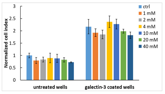 The potential blocking of cell adhesion on substrate-immobilized Gal-3 with LacdiNAc was also investigated. The wells in an xCELLigence E-plate were preadsorbed with Gal-3 at a 1 μM concentration, which proved as the optimum concentration for the adhesion of both ADSCs and HUVECs (see below in Figure 5 and Table S1 in the Supplementary Materials). The wells were then blocked with 0.5% w/v BSA in PBS and were preincubated with 100 μL of pure DMEM containing LacdiNAc in concentrations of 0, 1, 2, 4, 10, 20, and 40 mM at 37 °C. After 1 h, the wells were seeded with ADSCs at a density of 104 cells/well in 100 μL of pure DMEM containing the respective concentration of LacdiNAc. The cells were incubated at 37 °C in a humidified air atmosphere containing 5% CO2 in the xCELLigence system, where the cell adhesion was monitored every 15 min for 4 h.