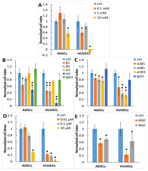 Role of integrins in the initial adhesion of ADSCs and HUVECs to substrate-immobilized Gal-3 (1 h after seeding). (A) The cells were seeded in a medium containing EDTA in concentrations ranging from 0.1 to 10 mM. (B) The cells were seeded in the medium containing antibodies against the β1, β3, α3, and αV integrin subunits. The antibody against αV integrin subunit was used in a 1:25 dilution, and the other antibodies were used in a concentration of 20 μg/mL. Nonspecific mouse IgG1 was used as an isotype control. (C) The cells were seeded in the medium containing antibodies against α2β1, α5β1, or αVβ3 integrin receptors. Nonspecific mouse IgG1 was used as an isotype control. Antibodies were used in a concentration of 20 μg/mL. (D) The cells were seeded in a medium containing the αVβ1 inhibitor in concentrations ranging from 0.01 to 10 µM. (E) The cells were seeded in a medium containing the GRGDSP peptide. The GRADSP peptide was used as a negative control. Both peptides were used in a concentration of 200 µM. Before cell seeding, the wells were coated with 1 µM Gal-3 and blocked with 0.5% w/v BSA. The cell index values were normalized to the untreated sample in a pure medium without any additive (ctrl). Mean ± SD from 3 wells. Holm-Sidak test, p ≤ 0.05. The samples were statistically compared within the group of the indicated cell type. * Statistically significant difference in comparison with the control cells (ctrl). # Statistically significant difference in comparison with the cells incubated with the isotype control (IgG1).