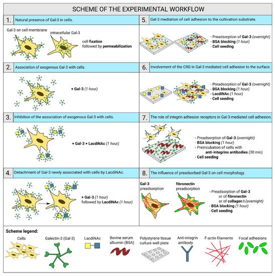 First, we verified the natural presence of Gal-3 in the used cell types, and then, we investigated (i) the ability of exogenous Gal-3 added to the culture medium to associate with cells and (ii) the ability of Gal-3 immobilized on the cultivation substrate to mediate cell adhesion. We found that exogenous free Gal-3 was able to associate with cells, and this association was reduced with Gal-3 ligand LacdiNAc in a concentration-dependent manner, while, importantly, cell adhesion to the substrate-immobilized Gal-3 was insensitive to LacdiNAc. These results indicate that while the free Gal-3 binds cells through its carbohydrate-binding site on the CRD domain, the Gal-3 immobilized on the cultivation substrate binds cells by another yet not fully explored site on its molecule; apparently, this binding site interacts with β1 and αV integrins on the surface of the cells, such as α5β1, αVβ3, and αVβ1 integrins. A comprehensive summary of our experimental work with its main findings is shown in Scheme 1.