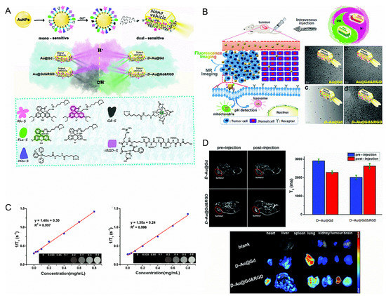 Yua et al. designed two pH-sensitive MRI/FI bimodal agents based on AuNPs (Figure 1). The first (Au@Gd and Au@Gd&RGD) contained rhodamine derivatives that were sensitive to acidic conditions, which facilitated the monitoring of the impact of pH changes of lysosomes in living cells. The second (D-Au@Gd and D-Au@Gd&RGD) included two pH-responsive fluorophores, rhodamine and fluorescein derivatives, which could provide a very accurate intracellular pH map and could also be used to calculate the pH of living cells. Additionally, authors also developed an imaging agent (D-Au@GD&RGD) that could determine the location and size of tumors and evaluate the effect of treatment in vivo. It could also be used at the cellular level to monitor the pH changes in cancer cells [36].