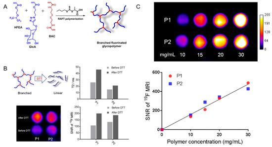 (A): Synthesis of branched fluorinated glycopolymers by a one-pot RAFT Polymerization. (B): (Upper left) the transformation of a branched structure to a linear structure when the polymer is exposed to high levels of DTT; (Upper right) a comparison of the T2 relaxation time of P1 and P2 before and after treatment with 10 mM DTT; (Lower left) a comparison of 19F-MRI images of P1 and P2 solutions before and after 10 mM DTT treatment; (Lower right) the signal-to-noise ratio of 19F-MRI of P1 and P2 solutions before and after 10 mM DTT treatment. (C): (Upper) the 19F-MRI of P1 and P2 solutions; (Lower) the 19F-MRI signal-to-noise ratio of P1 and P2 solutions within a certain concentration range [61]. Reproduced with permission from American Chemical Society 2019.