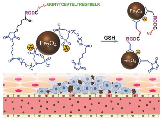 Gao et al. modified Fe3O4 NPs using in situ cross-linking reactive peptide sequences to achieve enhanced tumor imaging (Figure 3). The tumor-specific Arg-Gly-Asp peptide and the self-peptide were connected by disulfide bonds. In the tumor environment, peptides were cleaved using glutathione, facilitating the reaction between the exposed thiol groups and the maleimide groups located in adjacent particles. The labeling responsive particle nanoprobes with 99mTC, combined with the aggregation of Fe3O4 NPs triggered by the tumor microenvironment resulted in the enhancement of the T2 effect, it had anti-phagocytic surface coating, active targeting ability, and dual-mode imaging [71].