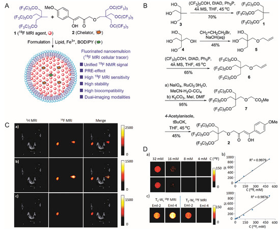 Studies have shown that iron deposition is often found in the brains of patients who have neurodegenerative diseases. Ryo et al. utilized tetrafluoro-p-phenylenediamine (TFPDA) as a 19F signal transmitter, which had a Fe2+ selective chemical switch. Considering the N-oxide chemistry, it produced symmetry-dependent Fe2+ response to the change in the 19F signal. The addition of Fe2+ to F-Nox-1 triggered changes in the 19F signal chemical shift and signal intensity. The response to Fe2+ had a higher selectivity than other bio-related metal ions. Additionally, the designed nanoprobe had the ability to detect Fe2+ in serum by 19F-MRI, which also contained multiple biological pollutants. The 19F-MRI imaging of the soluble Fe2+ species facilitated the direct monitoring of the increase in Fe2+ levels before iron deposit formation, which was a potential risk factor for neurodegenerative diseases. MRI nanoprobes could achieve high-efficiency targeted recognition of Aβ polypeptide and phosphorylated Tau protein through chemical modification. They had good biocompatibility, were conducive to penetrating the blood–brain barrier (BBB), and could significantly enrich the nanoprobe in the lesion area. They had higher imaging sensitivity and specificity than traditional Alzheimer’s disease imaging methods and provided a strong support for the early diagnosis of AD [74,75]. Researchers also analyzed cell labeling and tracing, such as stem cells, lymphocytes, nerve cells, and macrophages. Peng et al. used a phospholipid monolayer to coat molecules containing 27 fluorine atoms, fluorine-containing chelating agents and BODIPY fluorescent dyes, obtaining a highly stable and highly biocompatible bimodal nanoprobe for cell labeling [76] (Figure 4).