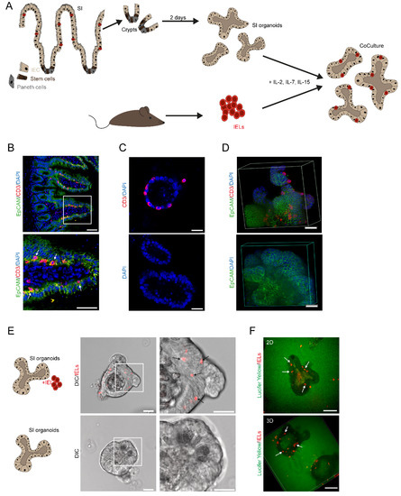 Seminal work discovering intestinal epithelial Lgr5+ stem cells within intestinal crypts as the crucial precursor paved the way for the broad availability of protocols to differentiate stem cells into three-dimensional intestinal organoids via the intermediate state of sphere-shaped intestinal epithelial cell structures ex vivo [16,17]. Moreover, the option of intestinal organoid generation ex vivo opened up the possibility to overcome the biggest obstacle of IEL-centered studies, i.e., the lack of protocols to reliably culture and study IELs ex vivo over time. In fact, small intestinal organoids were consecutively shown to provide the proper microenvironment allowing for IEL cultivation in a co-culture system ex vivo [18,19].