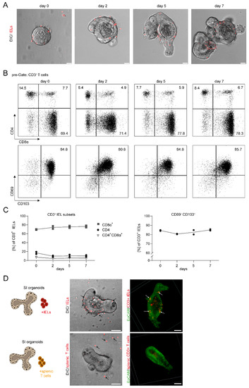 IELs remain alive, phenotypically stable, and localize to the IEC layer during a prolonged period of ex vivo co-culture. (A) IEL-IEC co-cultures with fluorescently pre-stained IELs (Cell Proliferation Dye, red) were monitored by confocal microscopy by SP5 in DIC from day 0 to day 7. Co-cultures were split before imaging. Scale bar 25 µm. Representative images of at least three independent experiments are shown. (B) IELs were removed from IEL-IEC co-cultures at different time points as indicated, stained with fluorescently labeled antibodies directed against CD3, CD4, CD8α, CD69, and CD103, and analyzed by flow cytometry. Representative FACS blots of two independent experiments are shown. (C) FACS-based kinetic analysis is shown for the expression and ratio of selected surface markers on CD3+ IELs obtained from IEL-IEC co-cultures as indicated. Results are pooled from two independent experiments. (D) Co-cultures were set up with small intestinal IEC organoids and either IELs or splenocytes from tdTOMATOCD4/CD8 reporter mice (red) as indicated. Co-cultures were analyzed by live cell imaging with confocal microscopy in DIC with the spinning disc (left) or after fixation and IF staining for EpCAM (right) with T cells from tdTOMATOCD4/CD8 mice. IELs and splenic T cells are shown in red. Arrows point to typical localizations of IELs and splenocytes, respectively. Scale bar 50 µm. Co-cultures with T cells from tdTOMATOCD4/CD8 reporter mice were incubated overnight before imaging. Representative images of three independent experiments are shown.