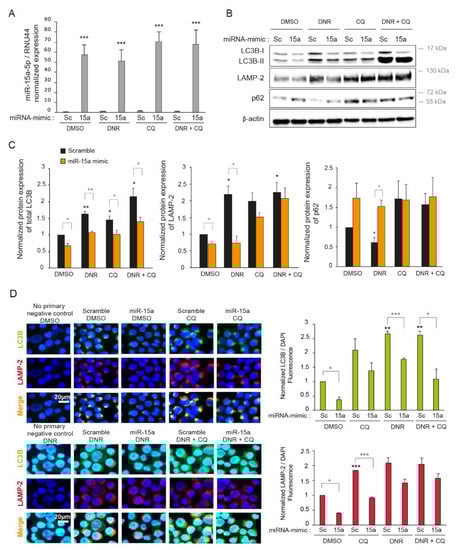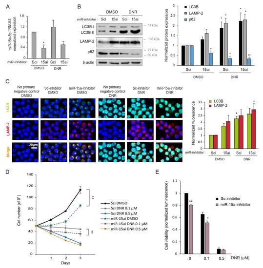 2.3. Overexpression of miR-15a-5p Inhibits Autophagy Induced by Daunorubicin