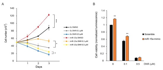 2.4. Overexpression of miR-15a-5p Increases Myeloid Cell Growth and Prevents Downregulation by Daunorubicin