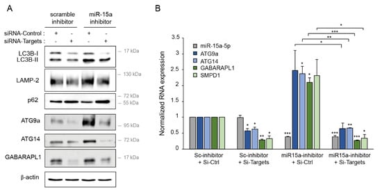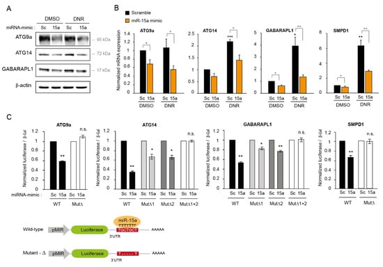2.6. MiR-15a-5p Downregulates the Expression of Autophagy Target Genes
