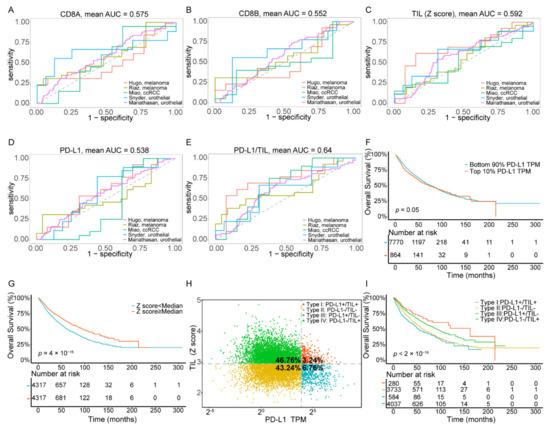 Immunotherapy dataset: Pre-treatment transcriptome information and post-treatment clinical response data from the five datasets of previous studies [28,29,30,31,32], whose patients received anti-PD-1 or anti-PD-L1 immunotherapy and were downloaded to evaluate the power of CD8A, CD8B, the TIL Z score, PD-L1, and the PD-L1/TIL Z score to predict clinical response to ICIs.