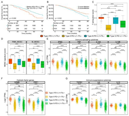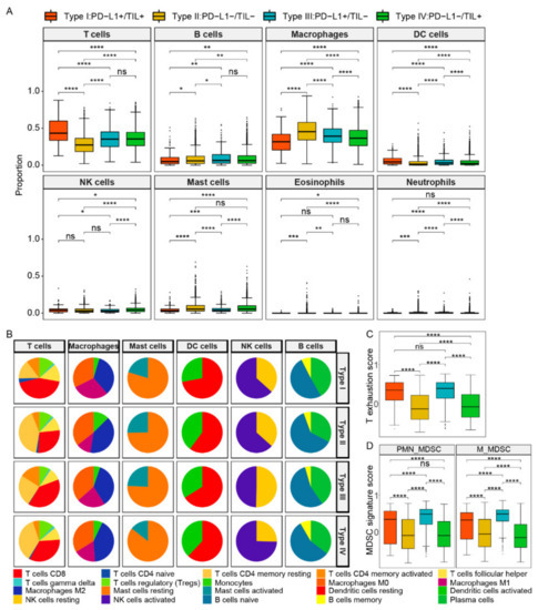 According to previous reports regarding the four TIME types [5], we stratified PD-L1 expression level and the TIL Z score into positive and negative groups: type I, PD-L1 positive with TIL positive; type II, PD-L1 negative with TIL negative; type III, PD-L1 positive with TIL negative; and type IV, PD-L1 negative with TIL positive, with a cut-off value of 90 percentile and median value, respectively. Additionally, a deconvolution approach [62], CIBERSORT, was applied to calculate the proportion of 22 immune cell types (https://cibersort.stanford.edu, accessed on 3 June 2019).