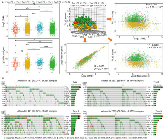 Here, we investigated the discrepancy of TMB and neoantigen among four subtypes (Figure 3A, Table S5) and we found that type III had a remarkable high somatic mutation burden and neoantigen compared to others (p value < 0.0001). As for type I, type II, and type IV, there were no significant differences of neoantigen, as well as type I and type IV of TMB. We also constructed a 3-dimensional dot plot base on TIL, TMB, and neoantigen and performed linear regression analysis between every two factors (Figure 3B). Notably, a statistically significant correlation between the TMB and the neoantigens number was found (Spearman correlation, R = 0.885, p value < 2.2 × 10−16, Figure 3B). However, there was no significant correlation between TMB and TIL (Spearman correlation, R = −0.084, p = 6.031 × 10−14, Figure 3B) or neoantigen and TIL (Spearman correlation, R = −0.066, p = 4.234 × 10−7, Figure 3B). A correlation between PD-L1 expression and TMB or neoantigen was not found either (Spearman correlation, R = 0.099, p value < 2.2 × 10−16 and R = 0.151, p value < 2.2 × 10−16, respectively) (Figure S2A, Figure 2B).