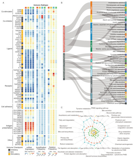 The transcriptomic pattern discrepancy in four TIME subtypes. (A) The immunomodulators gene expression and copy number variation for each subtype. (B) The shared and unique pathway features for each subtype. (C) The distinct difference weight score of pathways in each group. Abbreviations: CH*: carbohydrates, A*: Amino acid, E*: Endocrine, Im*: Immune, C*: Cancer, Xeno*: Xenobiotics.