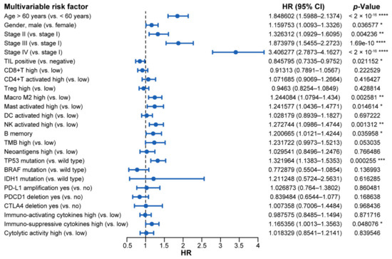 Significant variables (p value < 0.05) of the univariate analysis were into entered a multivariate Cox model. In the model, we examined several factors, including age, gender, tumor stage, TIL status (overall and specific cell types), TMB, neoantigen level, TP53, BRAF, and IDH1 mutation state, copy number variation of PD-L1, PDCD1, and CTLA4, and immuno-activating/suppressive cytokines and cytolytic activity (Figure 5, Table 3). We found that positive TIL was associated with a good prognosis and higher overall survival (Hazard Ratio (HR): 0.846; 95% CI: 0.734–0.975; p value = 0.02). In contrast, high Macrophage M2 and activated mast cells were associated with significantly higher overall mortality and were not conducive to survival (HR: 1.244; 95% CI: 1.079–1.434; p value = 0.0026 and HR: 1.242; 95% CI: 1.044–1.477; p value = 0.015, respectively). Furthermore, an advanced tumor stage, such as stage IV (HR: 3.406; 95% CI: 2.787–4.163; p value < 2 × 10−16) and stage III (HR: 1.874; 95% CI: 1.546–2.272; p value = 1.69 × 10−10), a high level of immuno-suppressive cytokines (HR: 1.165; 95% CI: 1.001–1.356; p value = 0.048), and TP53 mutation (HR: 1.322; 95% CI:1.138–1.535; p value = 0.000255) were all associated with poorer overall survival.
