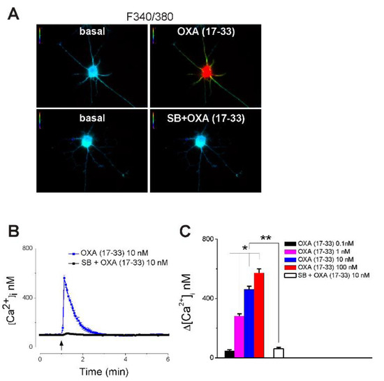 2.1. OXA (17-33) Increases Cytosolic Ca2+, [Ca2+]i, in Nucleus Accumbens Neurons via OX1 Receptor Activation