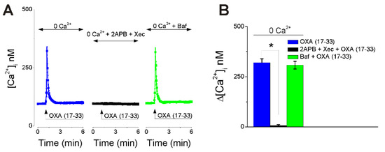 OXA (17-33) increases [Ca2+]i via IP3-dependent mechanism. (A) Illustration of average Ca2+ transients (± SD) induced in Ca2+-free saline by OXA (17-33) (10 nM) alone (left) and OXA (17-33) (10 nM) after pretreatment with 2-aminoethoxydiphenyl borate (2-APB, 100 µM) and xestospongin C (XeC, 10 µM, 15 min), IP3 receptor antagonists (middle), or with bafilomycin A1 (Baf, 1 µM) (right). (B) Comparison of the amplitude of the increase in [Ca2+]i (average + SD) in each condition. Pretreatment with 2-APB and xestospongin C abolished the Ca2+ response induced by OXA (17-33). * p < 0.05; n = 6 neurons/condition.
