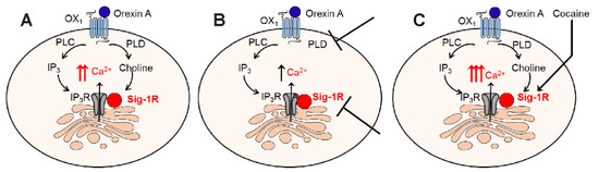Diagram illustrating the proposed model of potentiation of orexin by cocaine via Sigma-1R in nucleus accumbens neurons. (A) Orexin A acting on OX1 receptor activates PLC and PLD. PLC increases IP3 level and promotes the Ca2+ release from endoplasmic reticulum via IP3 receptors (IP3R). PLD produces choline (from hydrolysis of phosphatidylcholine) that acts on Sigma-1R to potentiate Ca2+ increase via IP3 R (higher increase in [Ca2+]i). (B) Inhibition of PLD or antagonism of Sigma-1R limits the orexin A-OX1 receptor signaling to PLC-mediated IP3-dependent increase in Ca2+ (smaller increase in [Ca2+]i). (C) Cocaine, via Sigma-1R activation, potentiates the PLC- and PLD-mediated increase in [Ca2+]i produced by orexin A acting on OX1 (highest increase in [Ca2+]i). The diagram was created using the Motifolio Illustration Toolkit Neuroscience (https://www.motifolio.com accessed on 7 March 2021).