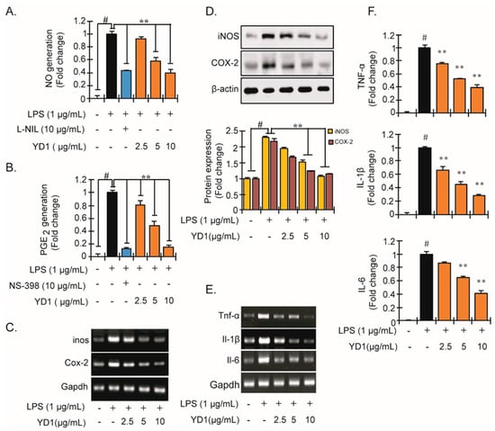 Inhibitory effect of YD1 on various inflammatory mediators in LPS-stimulated RAW 264.7 cells. Cells (5 × 105 cells/mL) were treated with various concentrations (f.c. 2.5, 5, and 10 μg/mL) of YD1 for 1 h and then treated with LPS (f.c. 1 µg/mL) for 24 h. NO generation was measured by Griss reagent (A); PGE2 productions was confirmed by ELISA (B); mRNA levels of iNOS and COX-2 were confirmed by RT-PCR (C); Protein expression of iNOS and COX-2 was identified by immunoblotting (D); mRNA expression of TNF-α, IL-1β, and IL-6 was confirmed by RT-PCR (E), and their corresponding productions were identified by ELISA assay (F). Densitometric analysis was carried out to quantify the band intensity by β-actin normalization. Results are expressed as the mean ± SD of three separate experiments. # p < 0.05 statistically different from untreated cells; ** p < 0.05 statistically different from LPS alone.