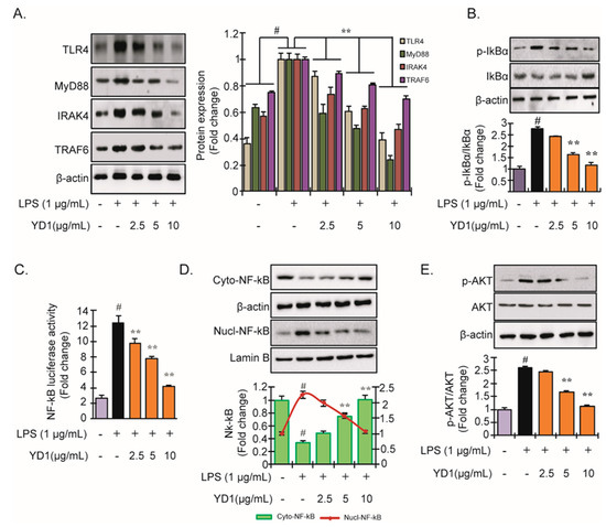 Inhibitory effect of YD1 on TLR4/MyD88/NF-κB signaling in LPS-stimulated RAW 264.7 cells. Cells (5 × 105 cells/mL) were treated with various concentrations (f.c. 2.5, 5, and 10 μg/mL) of YD1 for 1 h and then treated with LPS (f.c. 1 μg/mL) for 20 h for the protein levels of TLR4, MyD88, IRAK4, and TRAP6 (A); and for 1 h for p-IκBα and IκBα (B) in YD1-treated RAW 264.7 cells, which were analyzed by immunoblotting. NF-κB reporter gene assay was carried out according to the procedure described in materials and methods (C). Cells were pretreated with YD1 (2.5, 5, and 10 μg/mL) for 1 h and subsequently co-treated with LPS (1 μg/mL) for an additional 2 h, and the protein level of NF-κB in cytosol (upper panel) and nucleus (lower panel) was determined by immunoblotting (D). RAW 264.7 cells were pretreated with YD1 (2.5, 5, and 10 μg/mL) for 1 h and then stimulated with LPS (1 μg/mL) for 1 h, and phosphorylation levels of Akt were analyzed using immunoblotting (E). Densitometric analysis was carried out to quantify the band intensity by β-actin normalization. Results are expressed as the mean ± SD of three separate experiments. # p < 0.05 statistically different from untreated cells; ** p < 0.05 statistically different from LPS alone.