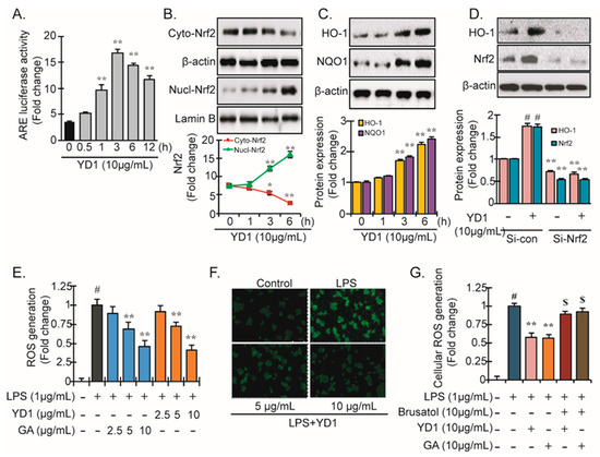 YD1 activates Nrf2-ARE signaling. RAW 264.7 cells were treated with YD1 (10 μg/mL) for the indicated time durations, and ARE luciferase activity was measured by a Dual Luciferase reporter assay as described in Materials and Methods (A). The levels of Nrf2 protein in cytosolic and nuclear fractions were analyzed by Western blot analysis (B). RAW 264.7 cells were treated with YD1 (10 μg/mL), and protein levels of HO-1 (upper panel) and NQO1 (lower panel) were analyzed by Western blotting (C). Densitometric analysis was carried out to quantify the band intensity by β-actin normalization. Data (mean ± SD) were representative of at least three independent experiments and expressed as the fold-induction relative to untreated cells (at time zero); ** p < 0.05 versus untreated control. RAW 264.7 cells were transiently transfected with Nrf2 siRNA for 24 h followed by YD1 treatment and incubated for 6 h. Nrf2 protein levels were measured by Western blotting analysis (D). Cells were pretreated by YD1 (2.5, 5, and 10 μg/mL) for 12 h, and subsequently stimulated by LPS for 24 h. The production of intracellular ROS was assayed using the fluorescent probe DCFH-DA (E). Immunofluorescent confocal microscopy showed the level of ROS (green fluorescence) in RAW 264.7 cells (F). Cells were treated with brusatol (a pharmacologically specific Nrf2 inhibitor) for 30 min, followed by YD1 and (10 μg/mL) and gallic acid (GA) (10 μg/mL) for 12 h and then subjected to LPS insult for 24 h, and the cellular ROS generation was measured (G). # p < 0.05 compared to the untreated cells; ** p < 0.05 compared to UVB-treated cells. $ p < 0.05 compared with YD1 and gallic acid-treated cells.