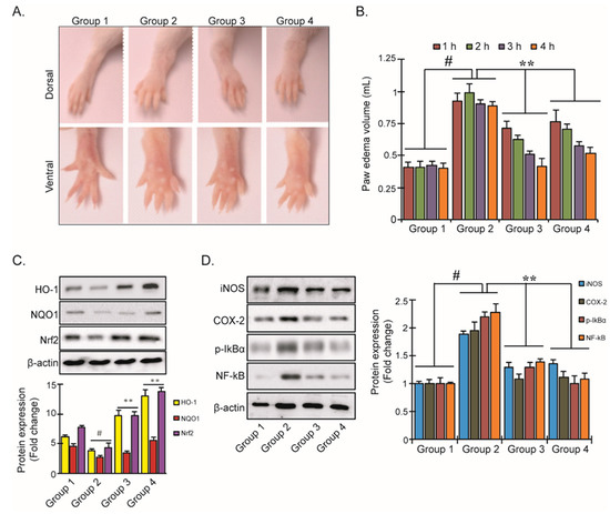 Inhibition of carrageenan (CA)-induced paw edema by YD1. All animals in each group received λ-Carrageenan (5 mL/kg body weight (i.p)) except group 1, which served as the regular saline control (5 mL/kg body weight (i.p)). Dorsal and ventral view of mice paw after 4 h of CA-induction (A). The degree of paw volumes was measured 0–4 h after CA injection, as described in Materials and Methods (B). Protein expression of HO-1, NQO-1, and Nrf2 (C) as well as iNOS, COX-2, p-IκB, and NF-κB in CA-induced mice (D). Densitometric analysis was carried out to quantify the band intensity by β-actin normalization. Results represent the mean ± S.D. of six animals. # p < 0.05 significant compared with vehicle-treated control; ** p < 0.05 significant compared with CA insult group.