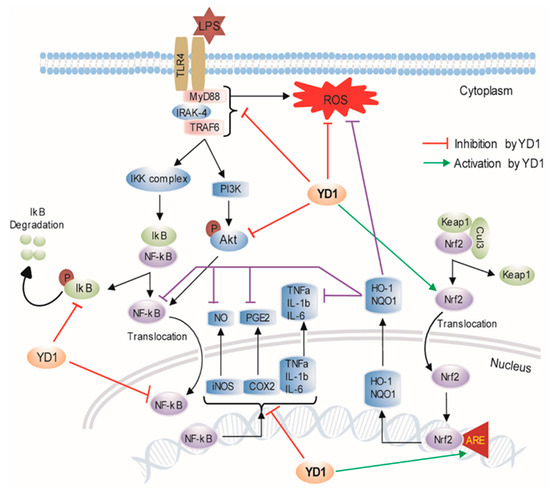 Many cells, such as neutrophils, endothelial cells, macrophages, and dendritic cells, possess TLRs [38]. Among the various TLRs, LPS is only recognized by TLR4. The TLR4-mediated pathway plays an important role in the induction of the inflammation response. The LPS-stimulated TLR4 facilitates the recruitment of the TLR Signaling Complex, which leads to the activation of NF-κB and subsequent expression of proinflammatory cytokines. We found that YD1 suppresses both the activation of TLR4 and the MyD88-mediated NF-κB signaling pathway through IκBα phosphorylation as well as degradation in a concentration-dependent manner in Figure 2. These results suggest that the inflammation induced by LPS can be suppressed by YD1 via modulation of the TLR4/MyD88/NF-κB signaling pathway. Further study would be interesting to look at the effect of YD1 on IKK activation, determined by immunoblotting with a phospho-IKK antibody. Further, the effect of YD1 on TLR4 activation of p38a and c-Jun N-terminal kinases (JNKs), as they belong to the mitogen-activated protein kinase (MAPK) family and are responsive to stress stimuli, can be determined to establish the specificity of YD1, and its effects on NF-kB and MAP kinase activation by TNF. In addition, the study of YD1 effects on TLR4 activation of activator protein 1 (AP-1), a transcription factor that regulates the expression of genes in response to a variety of stimuli, including cytokines, using the appropriate reporter assay will provide a firm picture by which NF-kB signaling is controlled by YD1.