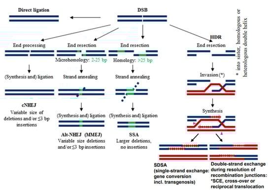 Because of the negative impact of DSBs on cell survival, several mechanisms of their repair were adopted during evolution already in prokaryotes and extended in eukaryotes. These mechanisms are characterized mainly by a different degree of homology requirements at break ends (Figure 1) and a particular enzyme equipment. They comprise direct ligation of ‘clean’ break ends (non-homologous end-joining = NHEJ), or microhomology-mediated (= alternative) end-joining (MMEJ) which require a few complementary bases at single-stranded overhangs of the break ends to align prior to ligation (for review: [,]). Another mechanism is ‘single-strand annealing’ (SSA) which requires longer single-stranded overhangs and larger regions of homology to pair before ligation (for instance the long terminal repeats = LTRs of LTR-retrotransposons) (for review: []). Other types of DSB repair, the variants of homology-directed recombination repair (HDR), include invasion of single-stranded overhanging break ends into (partially) homologous sequences, and their elongation over the broken region along the template sequence before resolution of the recombination structure (Holiday junction(s)) in a different manner (Figure 1) (for review: []).