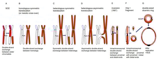 Different types of double-strand exchange. Via HDR (or NHEJ between two DSBs) the outcome of double-strand exchanges can be a SCE (A), a meiotic cross-over or a homologous translocation (B), a symmetric (C) or asymmetric (D) heterologous reciprocal translocation, an inversion (E) or a ring chromosome plus a fragment (F). A centric ring chromosome results after replication and odd numbers of SCEs in double-sized dicentric rings (G), which are unstable, due to bridge formation, and disrupted during nuclear division (see Figure 3).