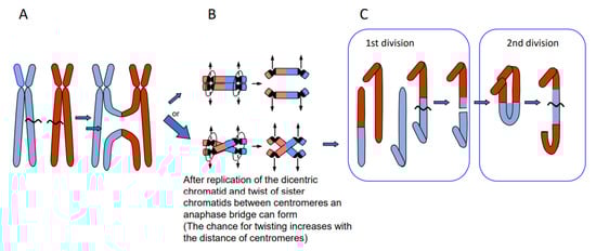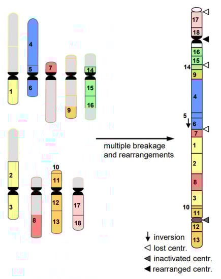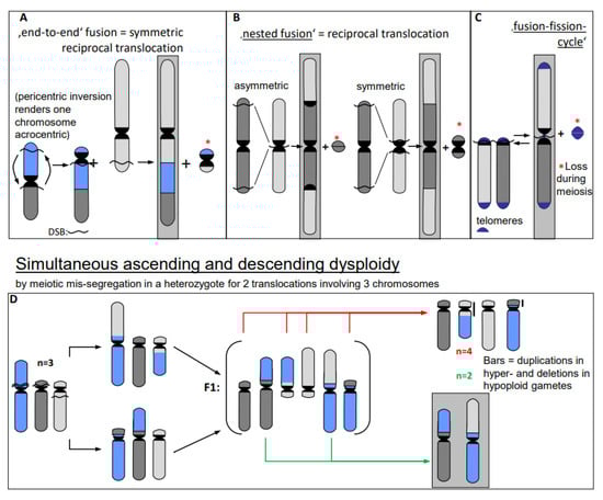 - Erroneous repair of DSBs can generate such primary chromosome rearrangements which can in turn be linked directly and/or via meiotic segregation errors with dysploid chromosome number alteration in both directions (Figure 6) (for review: []). Reciprocal translocation with breakpoints close to the centric ends of two acro- or telocentric chromosomes, which yield a large metacentric product and a small centric (or acentric) one, can reduce the chromosome number, if subsequent meiotic loss of the small product is tolerated [] (Figure 6A). Similarly, insertion of a chromosome with breakpoints at both termini into a break within the centromere of a recipient chromosome reduces the chromosome number, if two telomeres and one centromere get lost or the recipient centromere becomes inactive (Figure 6B; []). If a metacentric gets broken in the centromere region in a way in which both fragments maintain centromere function and get stabilized by telomeric sequences, the chromosome number increases (Figure 6C, arrow to the left). This process can be reversible by translocation between these novel centric ends (Figure 6B, arrow to the right).