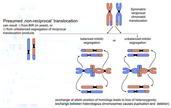 DSBs and their repair can happen in all cell cycle stages. If the DSB and its mis-repair occur in G1, the entity of exchange is the entire unreplicated chromosome. After replication, both chromatids of the translocated chromosomes are identical. If breakage and repair occur after replication (during the S or G2 phase), only one chromatid of each involved chromosome enters nuclear division in the translocated state. Consequently, one daughter cell receives the wild-type and the other the translocated chromosomes when the segregation is balanced. If the segregation is unbalanced, the genetic constitution of the daughter cells (if viable) gives the impression of non-reciprocal translocation (Figure 4). The results are either loss of heterozygosity (if the involved chromosomes were homologs), or a complementary duplication/deletion between daughter nuclei (if the involved chromosomes were heterologs). However, non-reciprocal translocations have never been observed in statu nascendi, and unbalanced segregation (or alternatively BIR in yeast) is the more likely interpretation of the observed phenomenon.