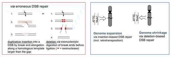 Figure 5. Insertion- or deletion-biased DSB repair can lead to expansion or shrinkage of genomes. The inserted sequence can also be a transposable element. Preferential dysploid chromosome number reduction can also be considered as deletion-biased DSB mis-repair (see Figure 6).
