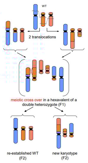 - In addition to primary rearrangements (deletion, inversion, translocation), secondary rearrangements (Figure 7) also depend on DSBs. Secondary rearrangements may occur in individuals which are heterozygous for two rearrangements with one chromosome involved in both rearrangements. If meiotic cross-over takes place between partially homozygous regions of rearranged chromosomes (flanked by different regions on either side of the cross-over), a newly rearranged chromosome segregates to one daughter nucleus and the re-established wild-type chromosome to the other. This pathway was also experimentally proven for plants, and might occur in other eukaryotes as well (for review: []).