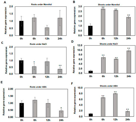 Arabidopsis WT seeds were surface-sterilized as described in [43]. The sterilized seeds were germinated and grown on a nylon screen placed on top of ½ strength solid MS media with vitamins (PhytoTechnology Laboratories, Lenexa, KS, USA), supplemented with 0.8% (w/v) Phytoblend agar (Caisson Laboratories, Smithfield, UT, USA), and 1% (w/v) sucrose, in Petri dishes for two weeks. Arabidopsis seedlings were exposed to 100 mM D-mannitol, 100 mM NaCl, and 2.5 μM ABA in liquid culture. Plant shoot and root samples were harvested separately at 0, 6, 12, and 24 h time intervals; washed with deionized water, flash frozen in liquid nitrogen, and stored at −80 °C until RNA extraction and qRT-PCR analyses.