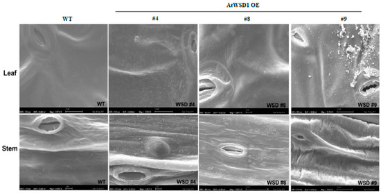 Scanning Electron Microscopy (SEM) showing the effects of WSD1 overexpression on epicuticular wax deposition in Arabidopsis leaf and stem tissues. Four-week-old Arabidopsis plants expressing the CaMV 35s::WSD1 gene cassette and WT grown in soil were examined for the epicuticular wax crystals by scanning electron microscopy. Bars = 2 μm.
