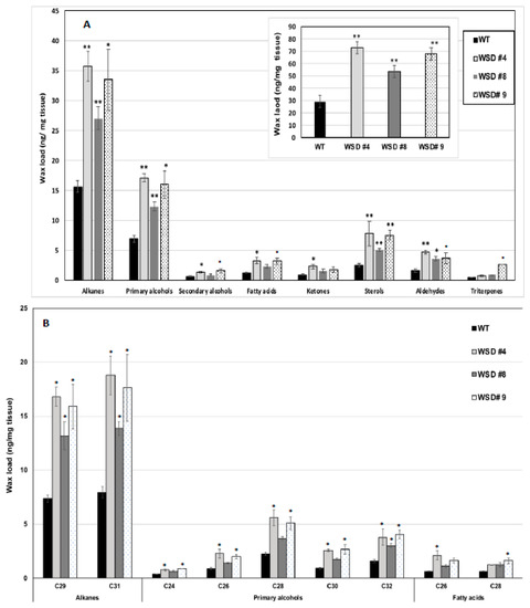Cuticular wax loading and composition in WSD1 transgenic and WT plants obtained from Arabidopsis stem tissues. Total wax loads and coverage (A) and carbon chain length (B) of individual compound classes are given with standard error (n = 3). Rosette leaves of 4-week-old wild type (Col-0, WT) and WSD1 overexpressing grown in soil were used for analysis of cuticular wax loads. Three biological replicates were averaged and statistically analyzed using a Student’s t-test (** p < 0.01 and * p < 0.05). Bars indicate the mean values (ng per mg FW) ± standard error (n = 3).