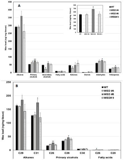 Furthermore, the SEM, GC/MS and GC-FID analyses confirmed that expressing WSD1 in Arabidopsis has caused alteration to the cuticular wax amounts and composition. The SEM imaging (Figure 2) indicated the formation of additional wax structures on the surface of the adaxial side of the WSD1 leaves and in higher abundances in stems than that on the WT plants. The WT Arabidopsis stem surfaces are known to be covered by different wax structures, including rods, plates, crusts, filaments, and tubes, while Arabidopsis leaf surfaces usually produce a very few wax crystals, or none [37,38]. Moreover, the wax load and composition of Arabidopsis leaf and stem tissues of both WT and WSD1 transgenic lines indicated obvious changes in the amount and the composition of cuticular waxes, which could be attributed to the increased WSD1 activity. Overall, the wax profiles observed in the current study in Arabidopsis WT leaf and stem tissues were consistent with the previous reports [7,30,34,38], with n-alkanes and fatty alcohols predominating, and with relatively lower amounts of fatty acids, ketones, sterols, aldehydes, and triterpenes. Moreover, the total wax load in stems is significantly higher than that in leaves (~32 μg cm−2 in stem compared to ~1μg cm−2 in leaf). Most of the WSD1 transgenic plants subjected to the GC analysis observed increases in the total wax load, particularly in the transgenic leaf tissues, relative to WT leaves. This increase in total wax load was mostly obtained from the increase in the levels of C29 and C31 n-alkanes, C28-C32 fatty alcohols, and sterols. The total wax load was also increased, albeit not significantly, in the stem tissues of WSD1 transgenics, with some transgenic lines showing slight increases in the levels of C29 and C32 n-alkanes and C26 and C28 fatty alcohols (Figure 4).