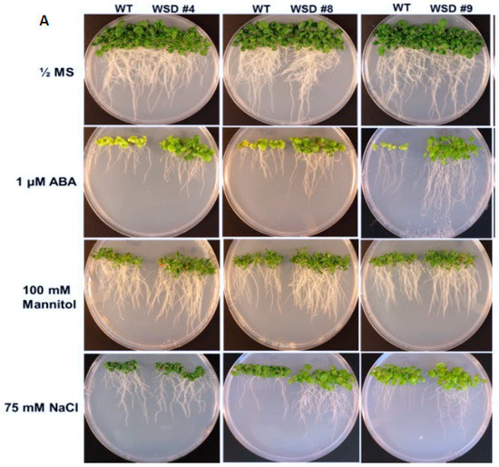 Stress tolerance/sensitivity assays were performed as described previously [44]. The WT and WSD1 transgenic seeds were germinated in ½ strength MS agar plates (with 1% sucrose) in the presence or absence ABA (1 uM), D-mannitol (100 mM), and sodium chloride (NaCl, 75 mM), and the seedlings were maintained for 21 days with a 16/8 h light/dark cycle at 22/18 °C day/night temperature. At the end of ~21 days, plants were photographed, and shoot fresh weight and root length were recorded.