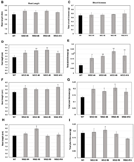 Screening WSD1 transgenics for tolerance to ABA, Mannitol, and salt stresses. WT and WSD1 transgenic plants were grown on ½ MS medium alone or supplemented with ABA (1 uM), Mannitol (100 mM), and NaCl (75 mM) for 21 days. (A). The transgenics are shown as WSD #4, 8, 9 and WT represent non-transgenic control plants. (B,D,F,H) represent root length (cm) measurements under control, ABA, Mannitol, and NaCl treatments, respectively. (C,E,G,I) represent plant total biomass (gm) under control, ABA, Mannitol, and NaCl treatments, respectively. Four biological replicates were averaged. The average and standard deviation values are represented for four replicates of 12 seedlings each for WT and all WSD1 transgenic lines. The asterisks represent significant difference in biomass accumulation and root length compared with WT plants, * p < 0.05, ** p < 0.01.