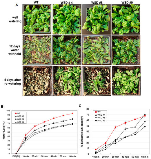 It has been shown that changes in cuticular wax quantity and composition can affect epidermal properties, i.e., epidermal permeability [11,30,33]. To support our findings that these changes, along with the alteration in epidermal properties, have caused the drought phenotype, we performed a chlorophyll leaching assay in Arabidopsis plants. WSD1 overexpressing plants showed reduced chlorophyll leaching compared to WT leaves, possibly due to lower cuticle permeability (Figure 6C).