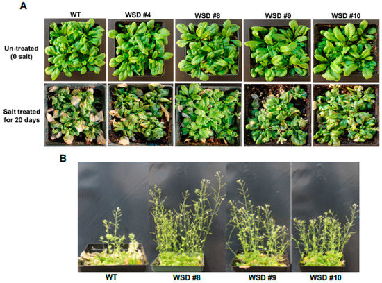 WSD1 overexpressing transgenic plants exhibit improved salinity-stress tolerance in Arabidopsis. Phenotypic changes in Arabidopsis transgenics and WT (Col-0) plants subjected to salt treatment. The images represent 4-wk-old Arabidopsis WT and transgenic plants either untreated (0 mM salt) or treated with water supplemented with 100 mM NaCl (A) and ~ 6-wk plants recovered from salt stress (B).
