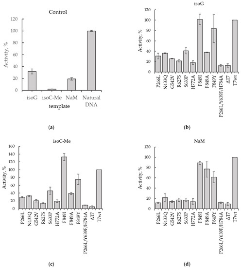 - Rusakova, E.E.; Tunitskaya, V.L.; Memelova, L.V.; Kochetkova, S.V.; Kostyuk, D.A.; Kochetkov, S. N. Mutant T7 RNA polymerase is capable of catalyzing DNA primer extension reaction. FEBS Lett. 1998, 423, 189–192. [Google Scholar] [CrossRef]